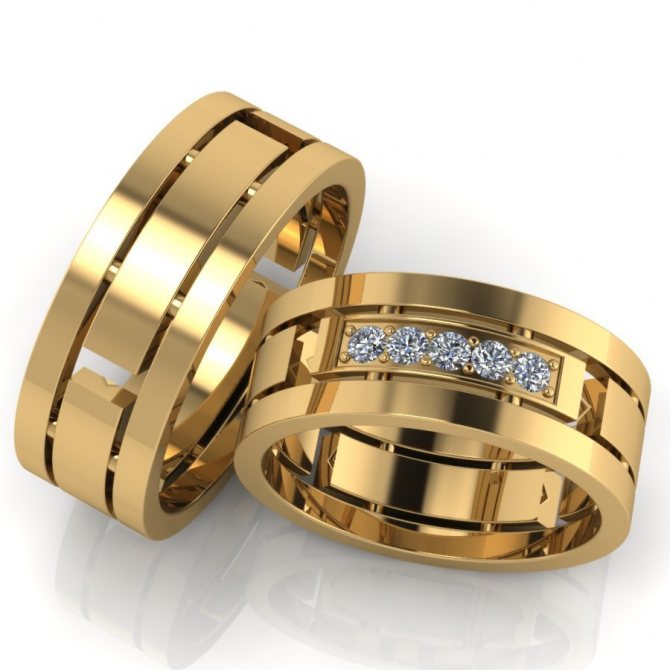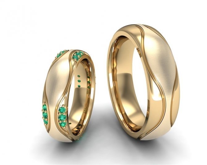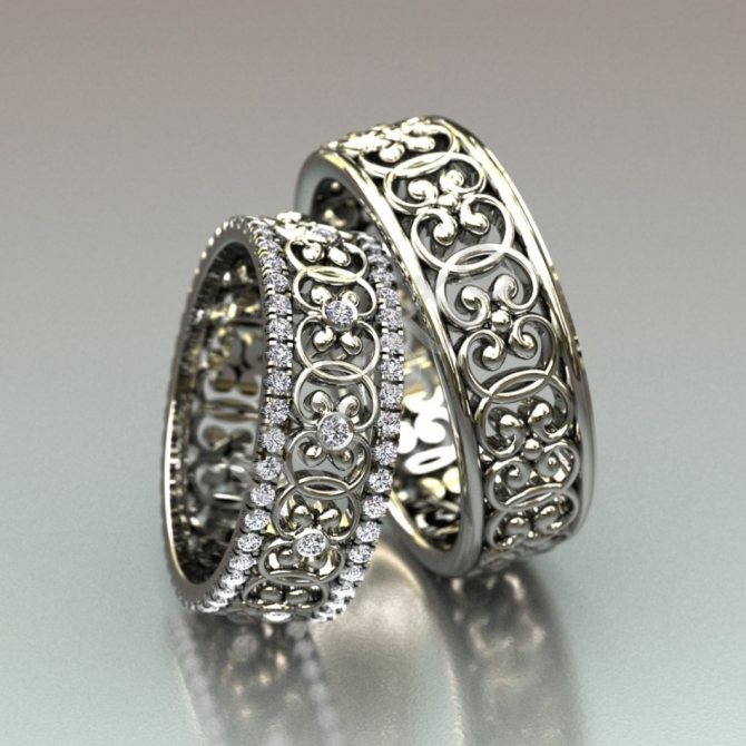 В парных обручальных кольцах допустим ажурный и витиеватый узор для женщины, а мужское изделие – более сдержанно, но обязательно в аналогичном стиле. Украшения выполняют из золота, серебра, платины. Оригинально смотрится сочетание белого и желтого золота.