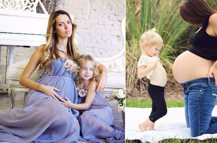 Красиво смотрятся фотографии без лица мамы, но с ее животиком в окружении папы, старших братьев и сестер или домашних животных, которые как бы прислушиваются к новому члену семью.