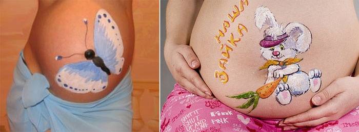 Еще несколько лет назад популярность набирал тематический боди-арт для беременных. На животе изображали киндер-сюрприз, маленького ребенка или сверток, который несет аист. Сейчас это хоть и актуально, но уступает новым веяниям.