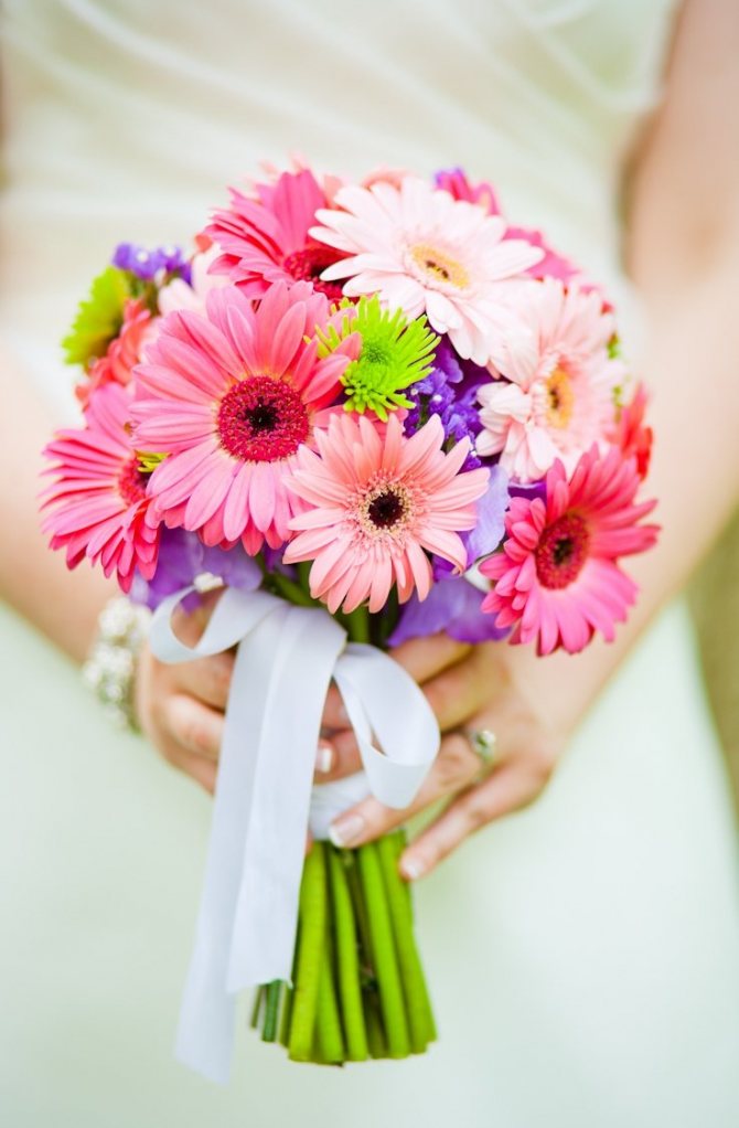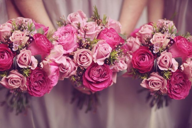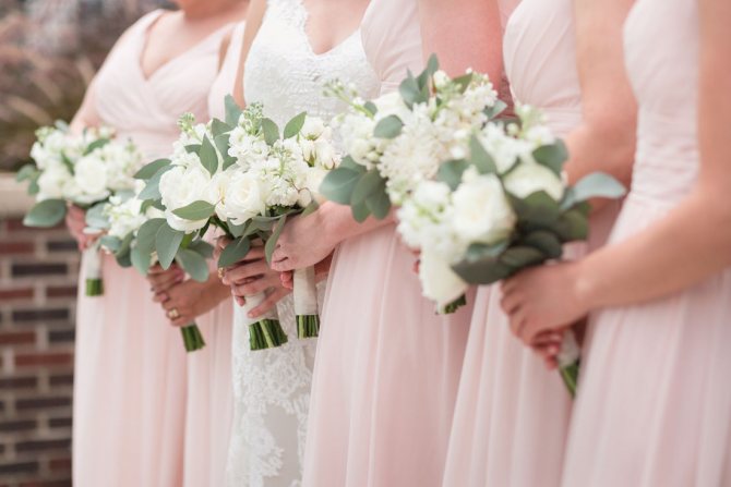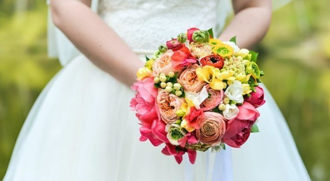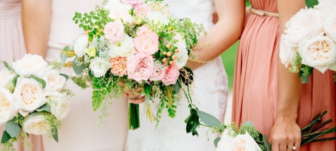 Совет! Цветы лучше подбирать на несколько тонов темнее платья. Также можно добавить к букету пару цветов ярких оттенков.
