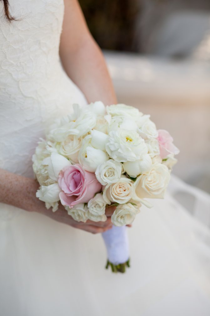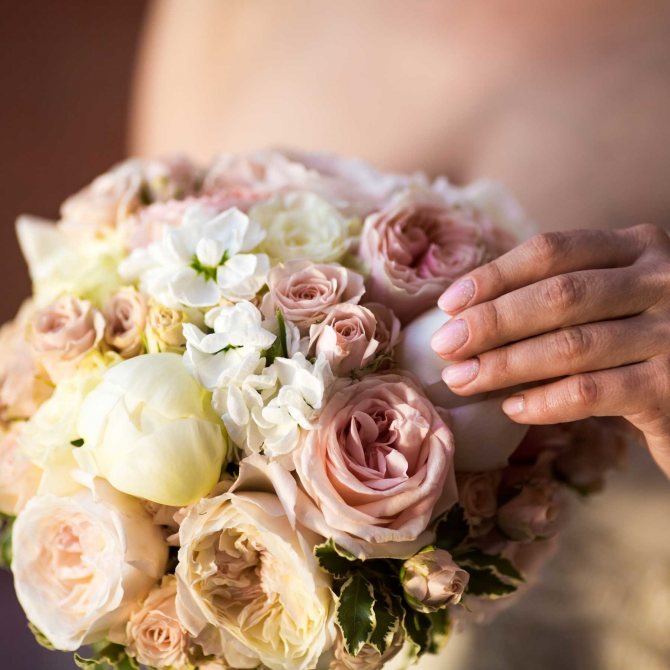При создании композиции важно обратить внимание на гармоничное сочетание. Яркий букет может смотреться броско на фоне белого платья и отвлекать внимание. Для традиционного варианта подойдет белоснежная или розовая цветовая палитра.