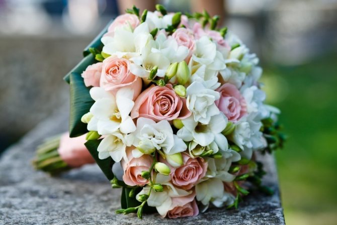 - Фрезии помогут создать воздушный и нежный букет. Цветовая палитра может быть белой, кремовой, сиреневой или оранжевой.