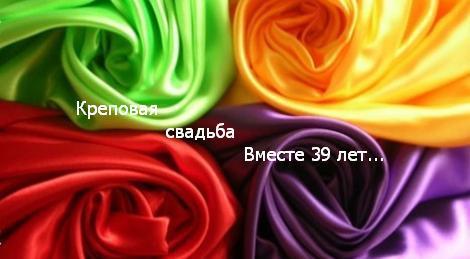 Годы идут незаметно, и время тихонько подкрадывается к 40-летию свадьбы. Но этой круглой годовщине предшествует другая 39 годовщина свадьбы, так называемая креповая свадьба. Многие просто не понимают, почему тридцать девятая годовщина свадьбы проходит под символом крепа. Этот материал был выбран не случайно, в нем разные нити настолько переплетены, что невозможно разорвать, как ни стараться. Надо сказать, что совместная жизнь супругов тоже настолько переплелась, стала крепкой, что ее не разрушить. Жизнь супругов уже давно представляет единое целое, у них уже давно все общее.