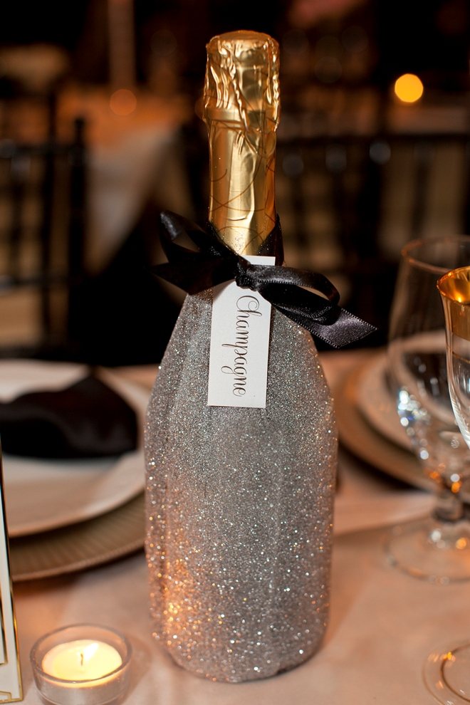 Отлично смотрятся бутылки, усыпанные блестками или выкрашенные в яркие цвета. Чем красят еще бутылки шампанского для свадебного банкета?