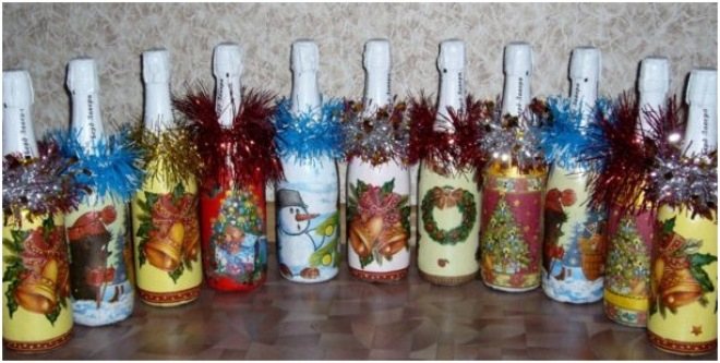 Чтобы оформить бутылку с помощью этой техники, нужно подготовить красивые салфетки. Лучше использовать двухслойные или трехслойные. Если шампанское будет подарочным, для оформления понадобятся не декупажные салфеточки, а фотографии, распечатанные на принтере (для этого требуется специальная плотная бумага). Перенос фото с бумаги на поверхность будет аналогичен стандартному процессу декупажа.