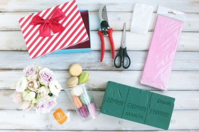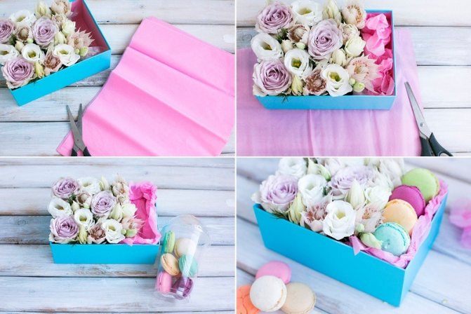 Съедобный подарок можно усложнить, немного изменив его состав. Для мамы, сестры или подруги на 8 марта или на день рождения сделайте коробку с живыми цветами и сладостями. Вместо последних можно положить бутылку вина, печенье макаруны или банку кофе.