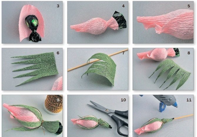 Бумага понадобится 2-х цветов: зеленая для листьев ананаса и желтая для декорирования конфет.