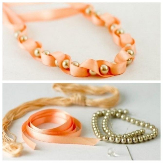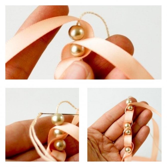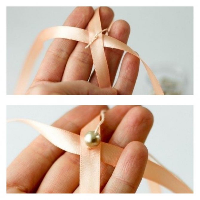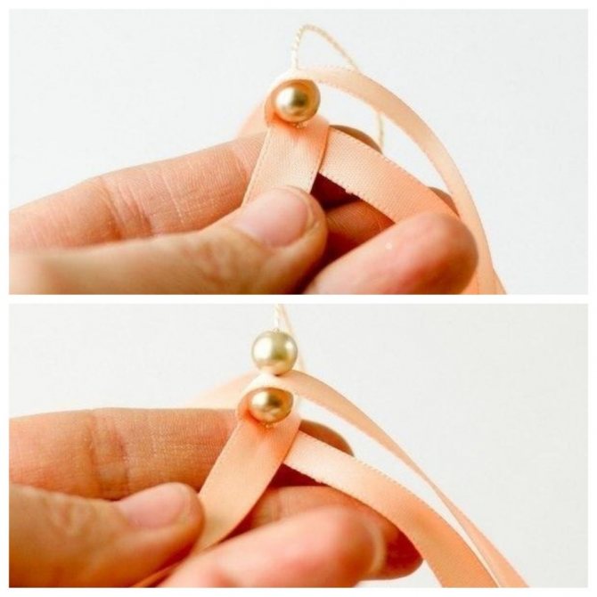 Проденьте вторую жемчужину и сверху накиньте нижнюю ленту. «Внутри» неё должны оказаться две бусины.