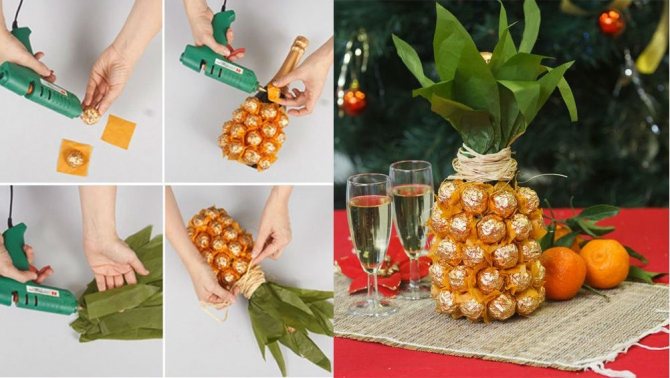 На Новый год принято дарить символические подарки. Можно сделать своими руками интерьерную ёлку, елочные шары, красиво украсить бутылку шампанского или сделать из неё ананас. Ананас из бутылки шампанского станет оригинальным украшением праздничного стола.