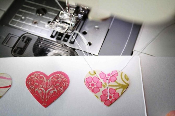 На машинке прострочите белой ниткой посередине, не выходя за границы сердечек. Затем сделайте несколько стежков обратным швом.