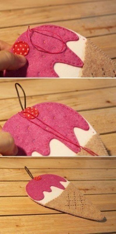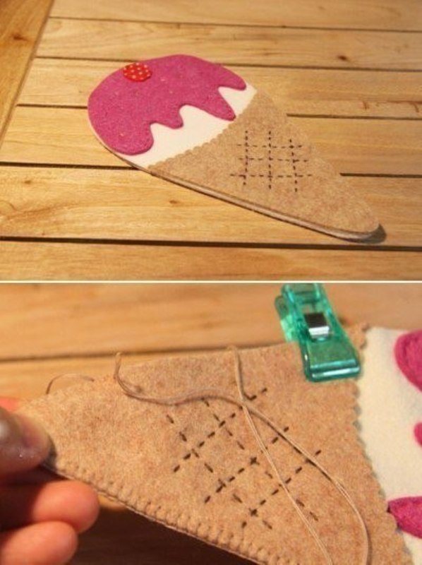 Соедините все детали вместе и прошейте. По контуру розового материала прошейте нитью в цвет маленькими стежками. По желанию можете сделать несколько декоративных строчек для украшения.