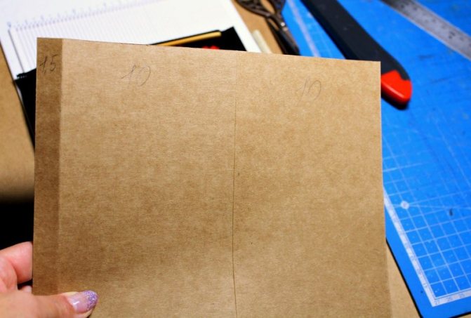 На картоне начертите размеры будущей открытки. В нашем случае: высота – 21 см, ширина – 10 см+10 см, место склейки – 1,5 см (см. фото 2). Вырежьте заготовку, а по линиям сгиба проведите беговкой, и аккуратно согните.