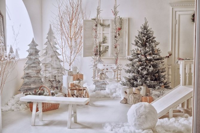 Решая, как украсить комнату, стоит помнить о необходимости обилия света. Должно быть много гирлянд, фонариков и искусственных свечей. Можно приобрести светильники в виде звезд, занавески с фонариками и так далее. Уместны будут заснеженные фальшивые окна и двери с рождественскими венками. Можно добавить в дизайн интерьера уютную мебель.