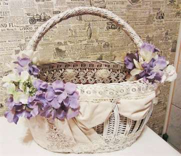 Подойдет также декорирование верха небольшими цветочками, сделанными из лент подходящего цвета. Всю наружную поверхность корзинки можно декорировать живыми цветами , важно только выбирать те, которые не вянут максимально долго. Для украшения подойдут также перья, бисер, блестки, кружева, ручная вышивка.