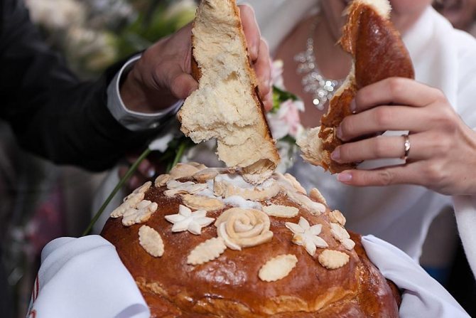 Затем молодожены отламывают по кусочку от каравая, обмакивают в соль и угощают друг друга. Причем посолить хлеб нужно от души, чтобы в семейной жизни супруги больше ничем не насолили друг другу.