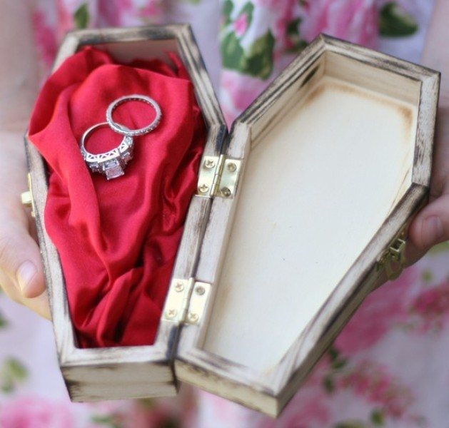 - Любители неординарных решений выбирают шкатулку, напоминающую гробик. С одной стороны под крышкой выгравировано слово «Навсегда», с другой – расположены кольца.