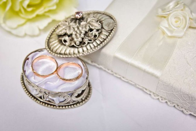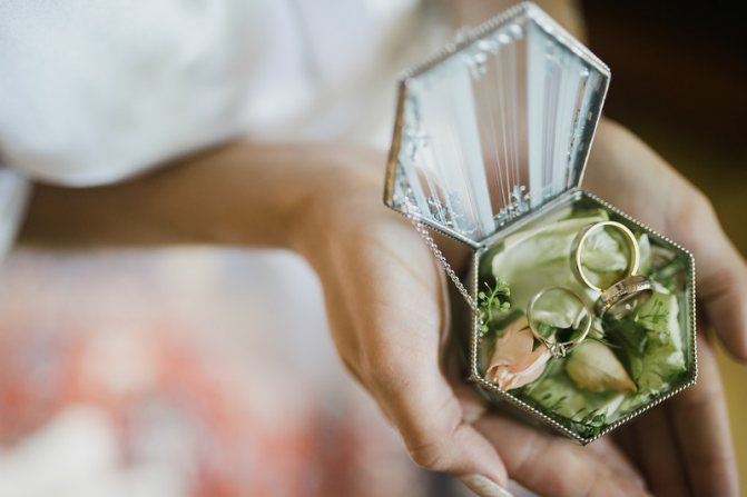 Трепетно смотрятся обручальные кольца, поданные любящей паре в специальной шкатулке или подушечке. Пусть они навсегда соединят сердца, а коробочка для колец будет передаваться следующим поколениям, как оберег семейного очага.