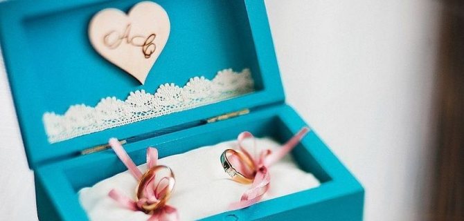 - Коробочки, идущие в комплекте с кольцами. Если нет желания выдумывать оригинальное решение, используют обычную коробочку.