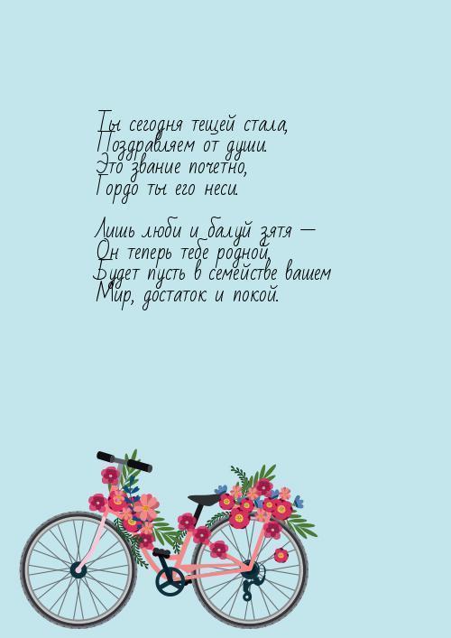 Тебя, сестричка, я с днем свадьбы поздравляю, Желаю с мужем быть до самого конца. Вам счастье суждено — я точно знаю — Господь благословил ваши сердца! Пусть чистый свет любви взаимной Вам осветит семейный путь, А ты, сестра, должна быть сильной, Пусть стороной обходит грусть!