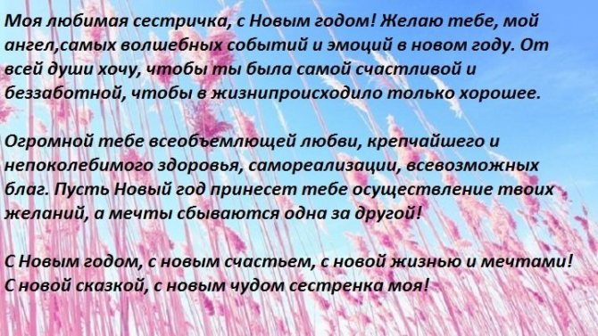 Дорогая сестра, поздравляю, Новый год уж стоит у дверей, От души я тебе пожелаю, Только ярких и солнечных дней. Пусть живется тебе интересно, Мирно, весело и без забот, Пусть несет тебе праздник чудесный Много счастья на сто лет вперед!