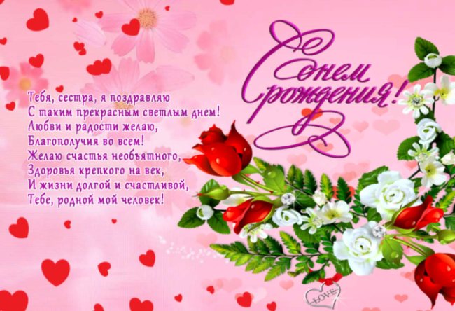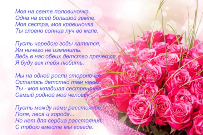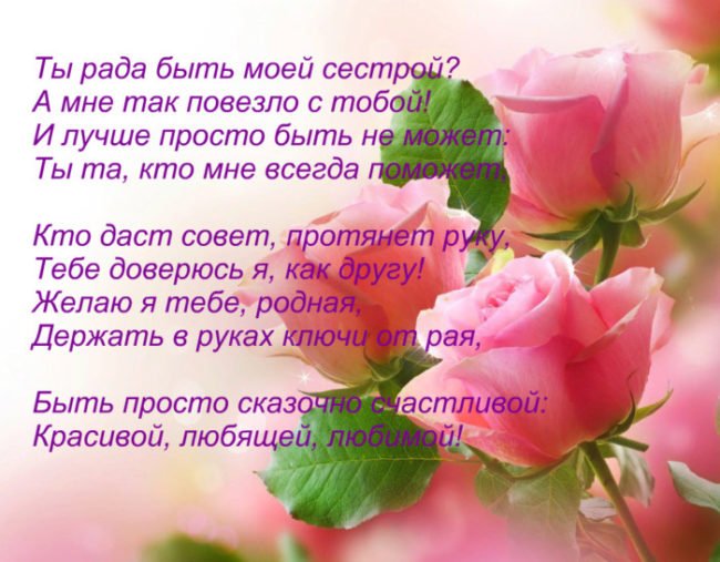- Мое сердце переполняется радостью и благодарностью, когда моя сестричка рядом! Ведь ты — мой самый дорогой и близкий человек. У меня нет никого дороже и ближе тебя. Хочу пожелать тебе самой счастливой и долгой жизни, пусть у тебя все будет хорошо. Будь всегда такой удивительной и непревзойденной!