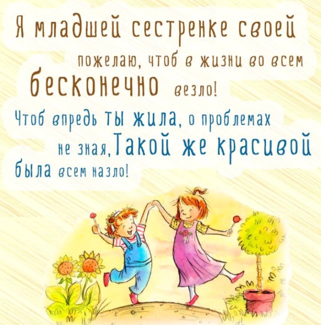- Моя дорогая младшая сестренка! Ты необычайно красива, умна и талантлива! С тобой всегда очень весело. Ты так лучезарна и позитивна, что твоей жизнерадостности может позавидовать каждый. Спасибо тебе за веселое настроение и яркие эмоции!