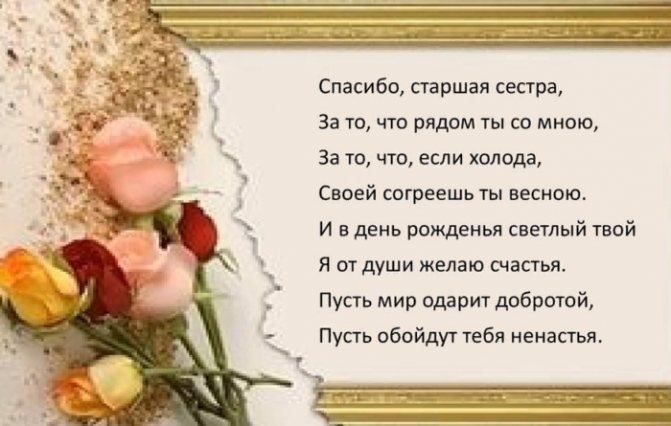 - Ты — самая красивая старшая сестренка на свете! Твоя лучезарная улыбка может свести с ума любого! Ты красивая, женственная, добрая и самая неотразимая! Я так благодарна тебе за доброту, поддержку, искренность, мудрость!
