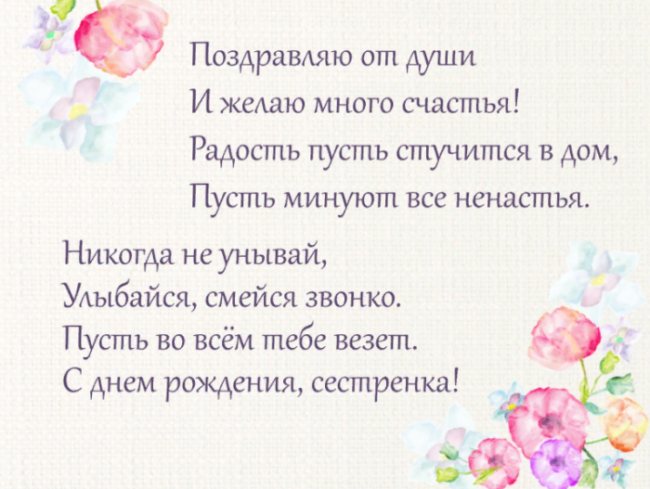 - Ты — самая искренняя, светлая, яркая, отзывчивая и добрая сестра! Желаю тебе, чтобы все твои мечты исполнялись, чтобы все поставленные цели были достигнуты, а в душе всегда торжествовала весна! Спасибо тебе, моя любимая сестричка!