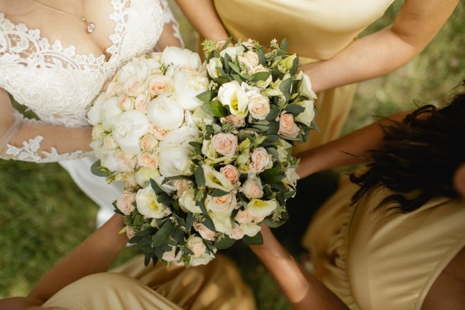 Совет! Стилисты рекомендуют придерживаться принципа «наоборот». Например, если ваш наряд пестрит большим количеством декора, камнями и стразами, букет должен быть скромным и сдержанным. И наоборот, когда ваша одежда лаконичная и не вызывающая, флористическая составляющая должна быть просто умопомрачительной!