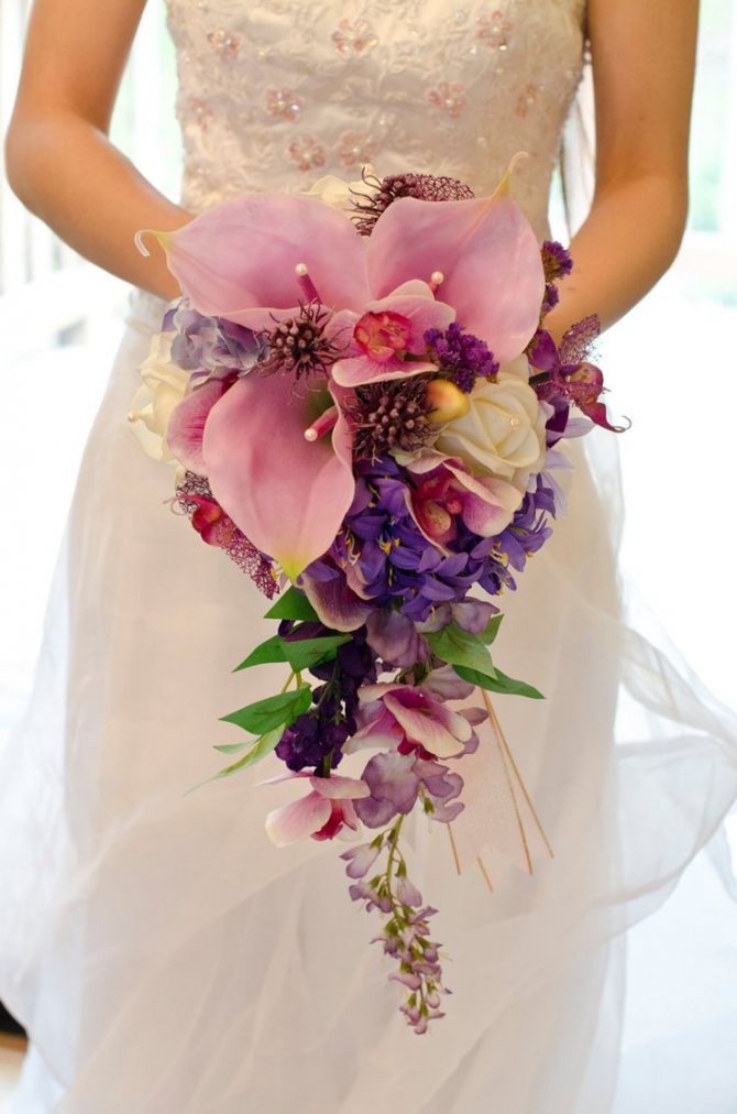 - Каскадная форма композиции позволит подчеркнуть грацию и элегантность высокой невесты. Такой букет будет гармонично дополнять наряд молодой девушки.