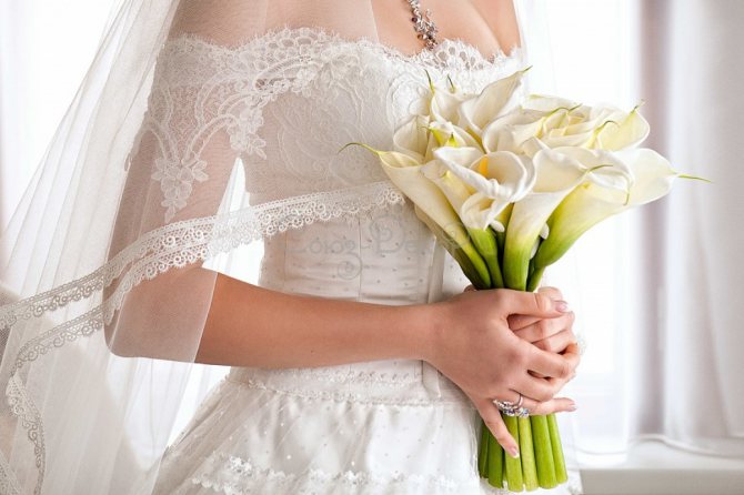 - При покупке атрибута не стоит полагаться на собственные вкусовые предпочтения. Причиной приобретения определенного флористического шедевра должно стать его гармоничное сочетание как с вашим платьем, так и с костюмом жениха.