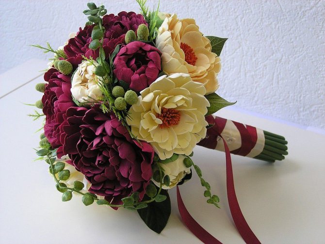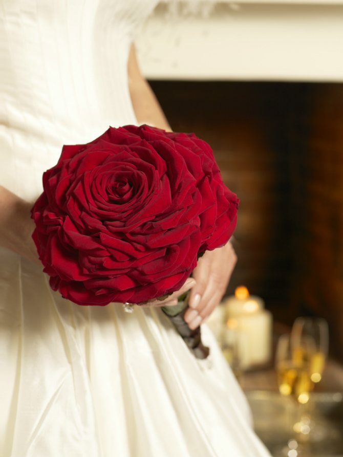 Совет! В последнее время особой популярностью пользуются тканевые шедевры. Из шелка, например, можно создать красивые бутоны и соцветия любого размера. Стоят они, конечно, дорого, но зато их можно хранить еще в течение ни одного десятка лет в качестве памятного сувенира. Вполне возможно, он перейдет по наследству вашей дочери, и вообще станет семейной реликвией.