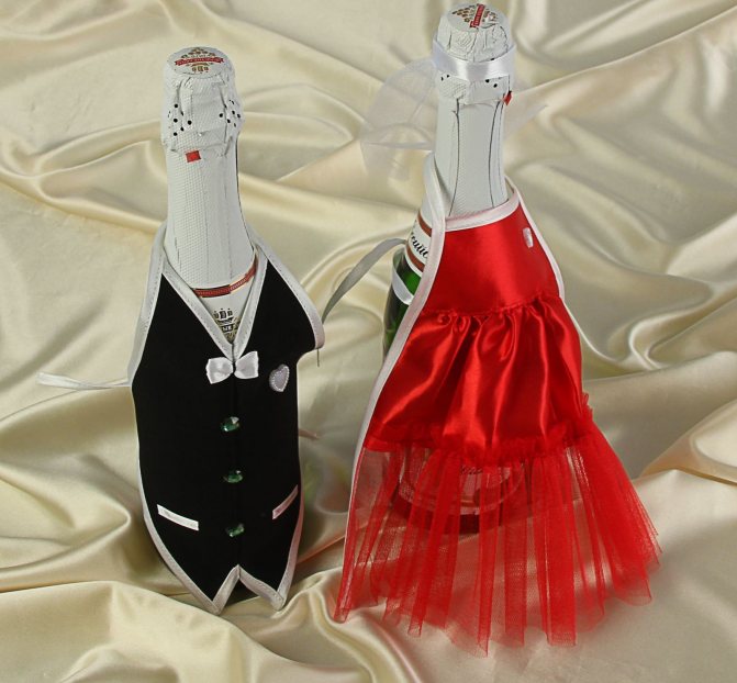Например, если это просто окрашивание белым аэрозолем, можно приобрести одну бутылку большего размера и украсить самодельной шляпой и бабочкой на горлышко. Тогда у бутылки меньшего размера может быть белая фата или юбка с 2-3 рядами воланов.