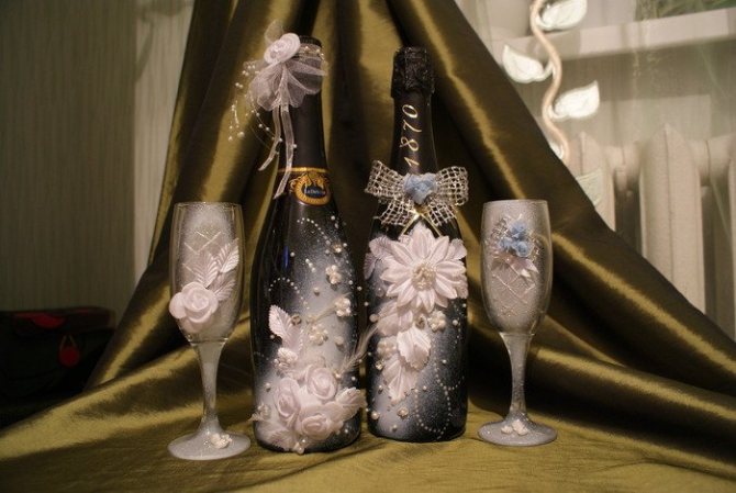Вариантов оформления масса – украшение объемными элементами, тканями и кружевом, жемчужинами, скрапбукинг, лепка. Неплохо смотрится напиток в бутылках, расписанных акриловыми красками вручную.