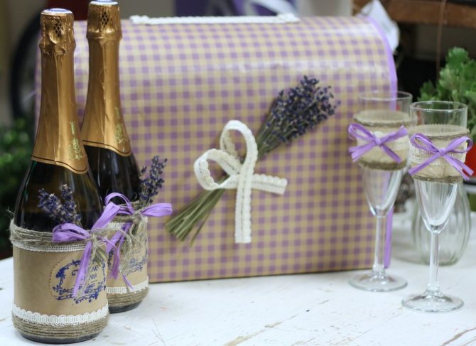 . К примеру, золотые и серебряные гравированные бутылки будут совсем не к месту на свадьбе в стиле бохо или прованс. А вот нежные цветочные мотивы и кружева – прекрасный вариант декора для классической свадьбы с аристократичными нотками.