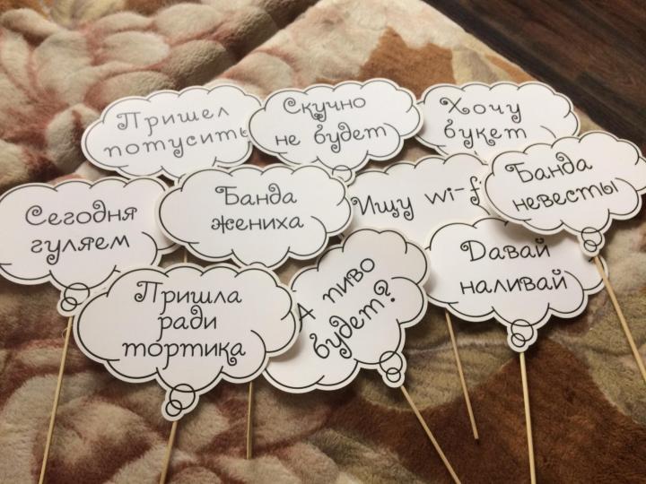Вариаций, как приобрести такой атрибут, несколько — создать самим или же заказать у специальной фирмы по печати на различных материалах, всё это можно уточнить у фотографа. Как показывает опыт, собственноручно можно реализовать более оригинальные надписи, а главное — неповторимые. Вот топ идей надписей фото-бутафории.