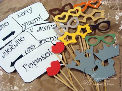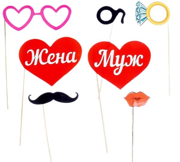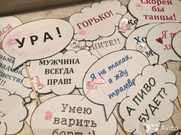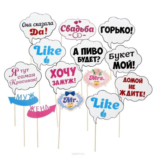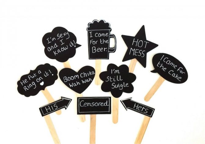 Переходим к основной детали — это надписи на самом атрибуте, слоганы или фразы. Они могут быть представлены какими угодно — романтическими, комическими, серьезными. Такие аксессуары подойдут для фотосессии не только молодых, но и гостей, в них можно отлично отобразить чувство юмора.