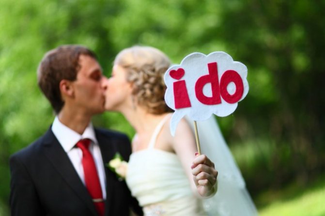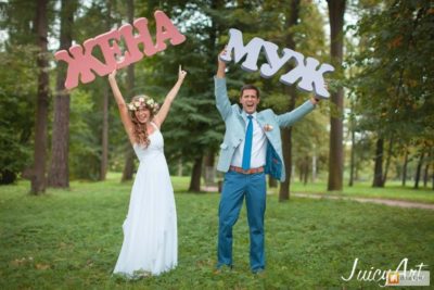 Распространенные варианты слов с объемных букв для фотосессии на свадьбу: любовь, женаты, свадьба, счастье, love, happy, just married, amore, amour. Также красиво выглядят на снимках фразы «Я согласна», «Навсегда», «Yes, I do», «Семья». Изысканно смотрятся надписи со знаками уравнения, к примеру, «Маша + Саша = Любовь» или надписи «Муж» и «Жена» с обращенными стрелками в сторону героев фотосессии.