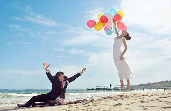 Еще одна идея – крылья, с ними можно сделать веселые и забавные фотографии, причем сначала с ними могут сниматься молодожены, а потом передать их в пользование гостям: согласитесь, полненький дяденька будет очень забавно смотреться в роли херувима, особенно, если ему подобрать достойную пару. Опять же, на шариках и зонтиках можно сделать забавные надписи, так что фотосессия пройдет весело и с огоньком.