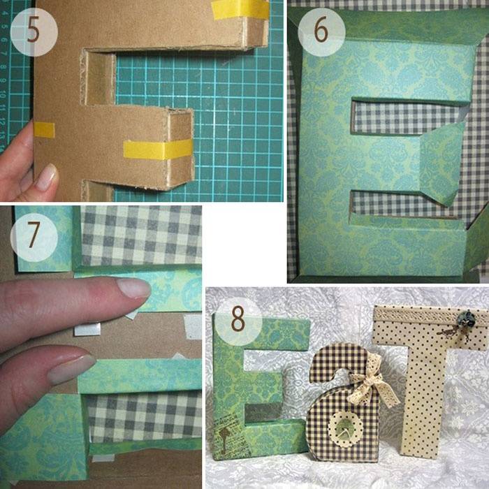 - Декорируем буквы: красим их яркой краской или обклеиваем красочной бумагой (некоторые обклеивают газетой в винтажном стиле, которую нужно разрезать на небольшие полосы), обшиваем тканью или промазываем клеем, а сверху посыпаем блестками.