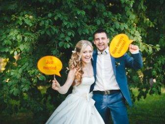 Сами фразы на них могут быть исполнены на русском или английском языке, а также на любом другом, например, родном для молодоженов. Фразы могут быть оформлены на табличке с помощью краски или глиттера. Не редкость, когда молодожены сами оформляют таблички с помощью маркеров или других пишущих предметов.
