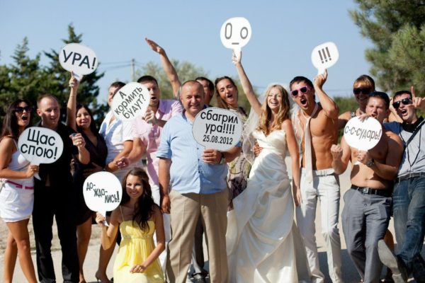 Если предстоит групповое свадебное фото, гости тоже могут держать в руках таблички с шутливыми надписями.