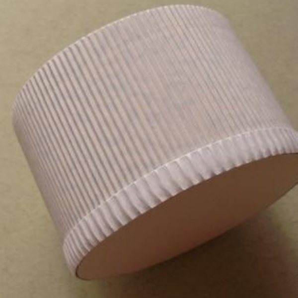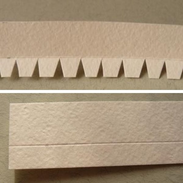 - Берется полоса гофрированного картона следующих размером: ширина ее 5 см, а длина складывается из длины передней стенки плюс 2 раза по 2/3 длины боковины. Этот элемент оклеивается той же бумагой, что и вся поделка.
