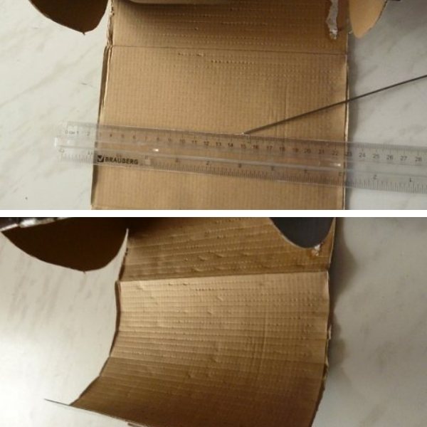 - Острым ножом отрезают часть коробки по нижней нарисованной линии с трех сторон – задняя сторона остается нетронутой.