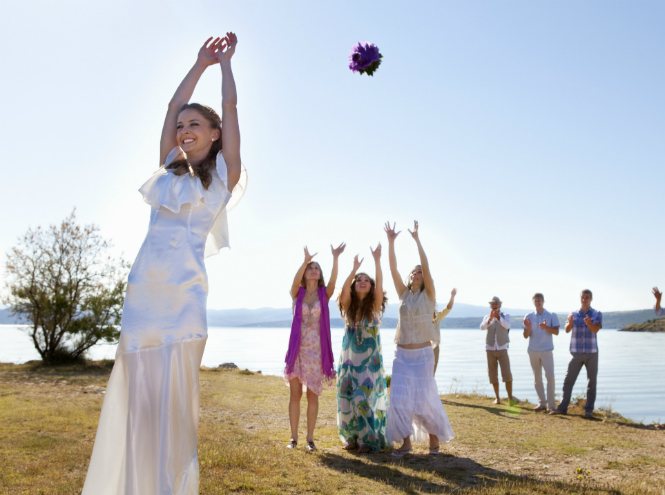 Этот обычай пришел гораздо позже. Голливуд внес в русскую жизнь свои коррективы. Многие благодаря романтическим фильмам узнали, что на Западе невесты бросают цветы за спину, а подружки его ловят. Эта давняя традиция зародилась в Европе или США, доподлинно неизвестно. Считается, что таким образом невеста отдавала частичку удачи незамужней подруге. Речь о замужестве при этом первоначально не шла.