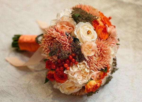 Осенью выбор делают в пользу ярких и насыщенных оттенков теплого спектра: от бежевого до сливочного. В букеты включают типично осенние цветы: