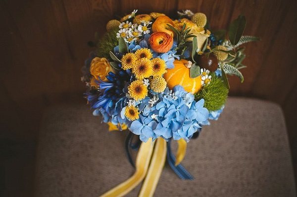 - Сказочный ансамбль получится, если и костюм жениха будет в синих тонах. В крайнем случае возможна бутоньерка, перекликающаяся с букетом;