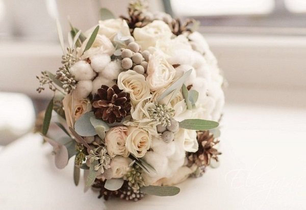 Зимним невестам подойдут классические круглые или каплевидные формы. Идеальные цветы – чайно-гибридные или мелкие кустовые розы, орхидеи, хризантемы. Эффектнее всего смотрятся цветы в холодной сероватой или розоватой гамме.