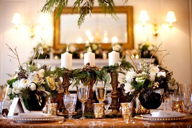 У зимней свадьбы есть свои предпочтения: можно украсить столы и стены ветками ели, сосны, хвойными венками, свечами.