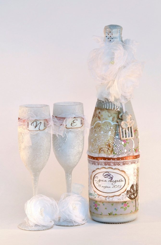 «Одетые» словно молодожены бокалы для шампанского также вызовут неподдельный интерес, особенно если создавались они своими руками.